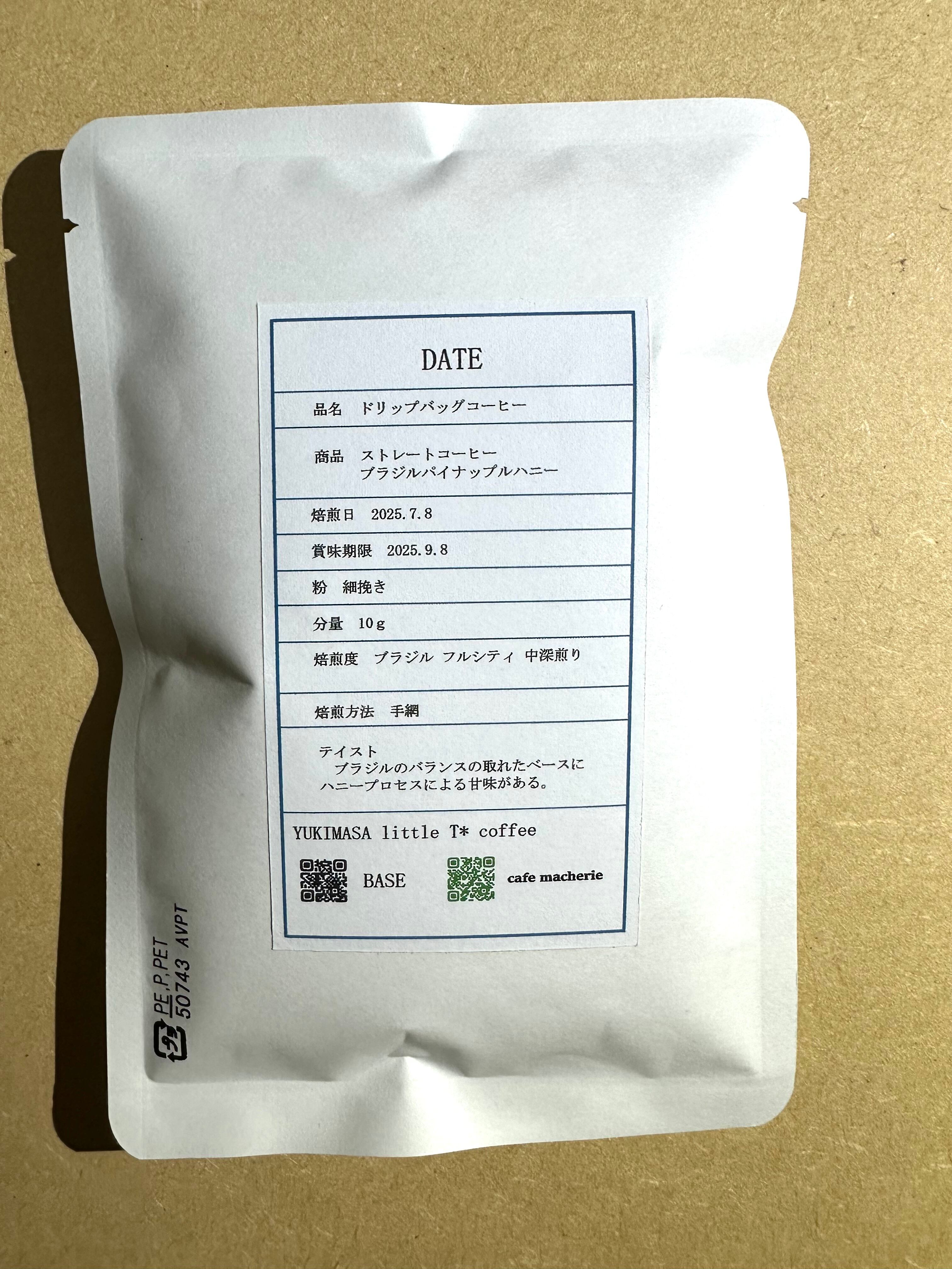 商品① ブラジルパイナップルハニーのみのシングルコーヒー 焙煎度は中深煎りで粉量10gとなっています。