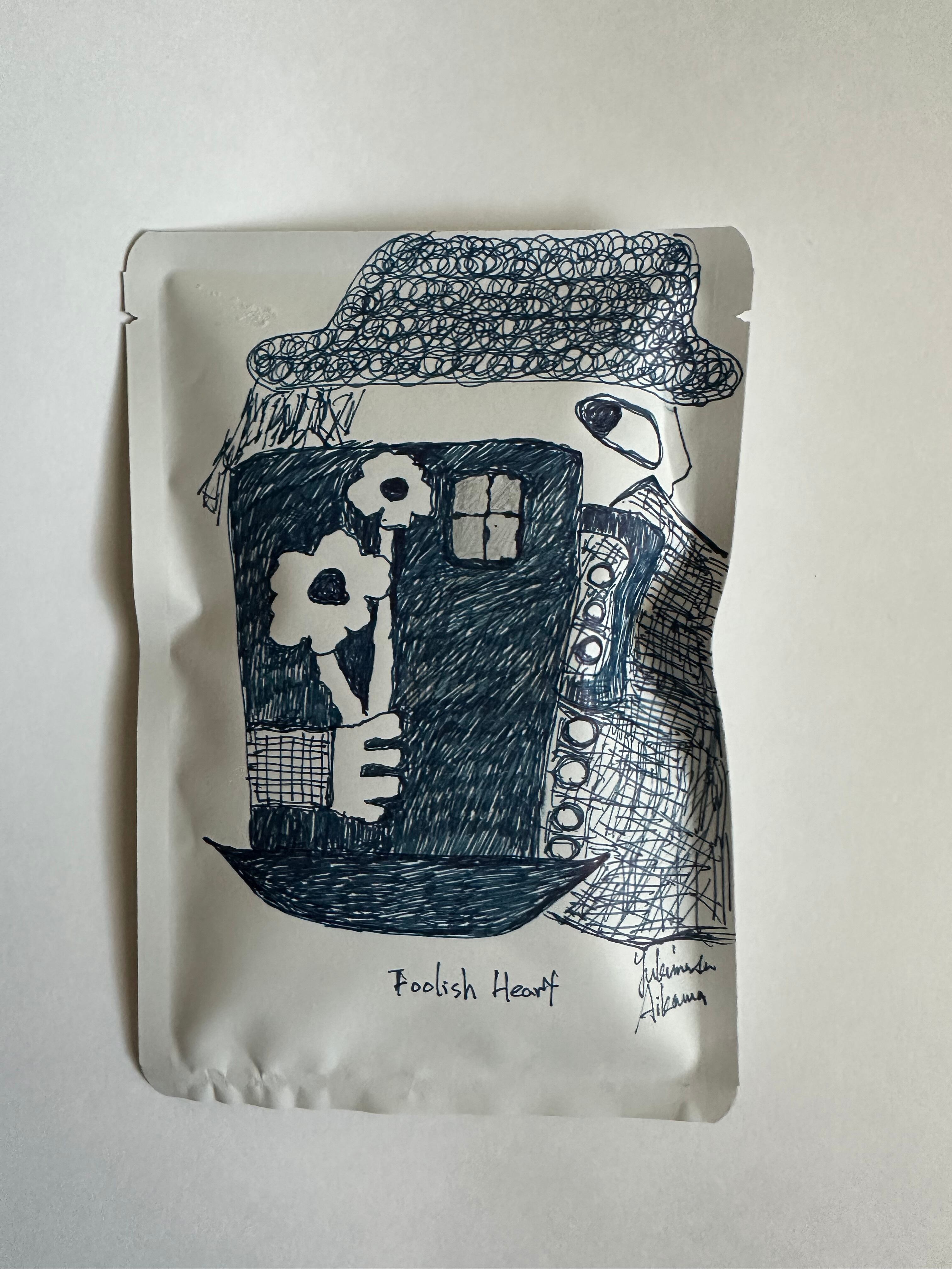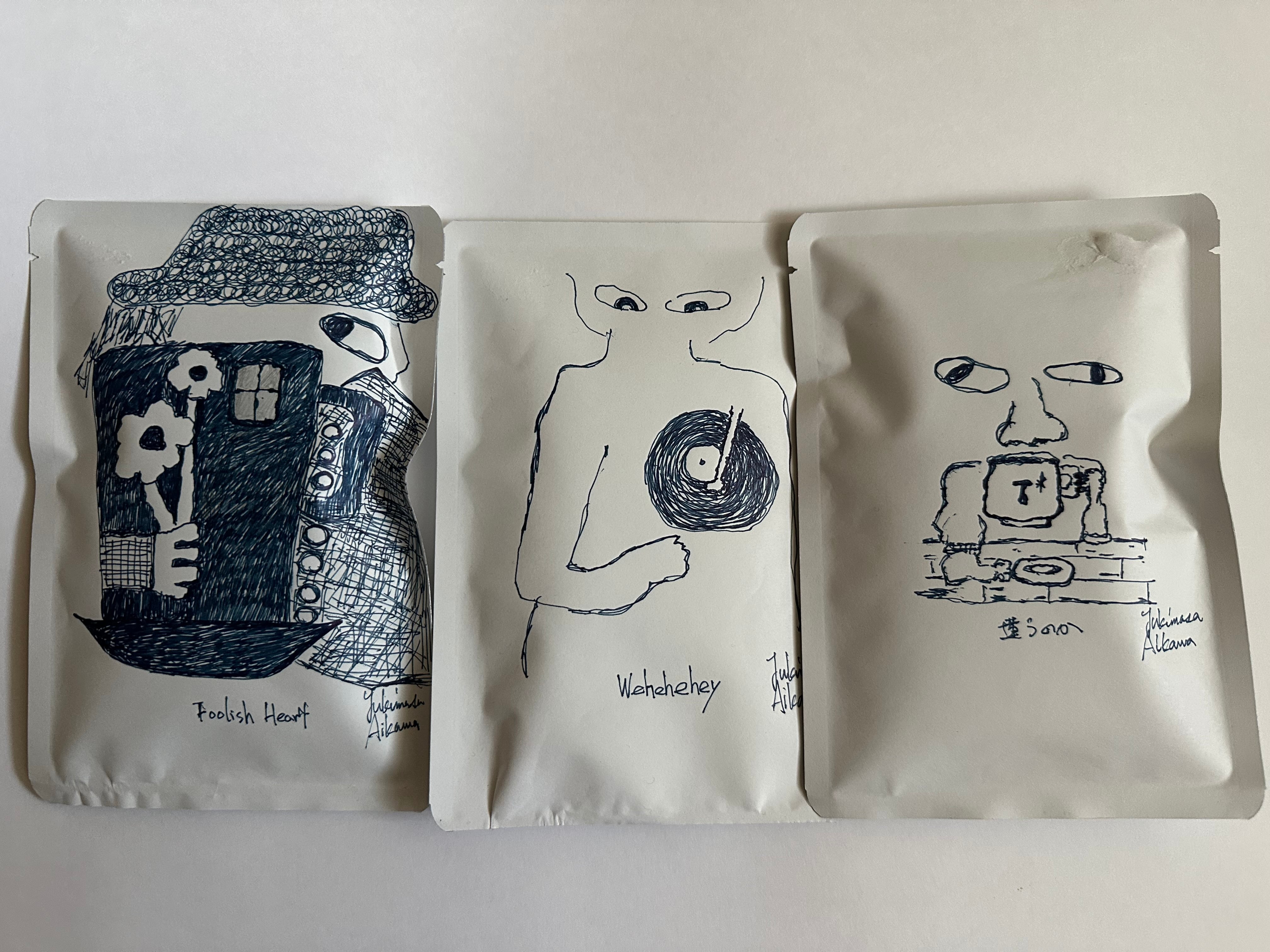 パッケージアートは、ペンでラフに描きました。テーマ「Blue Heart」です。